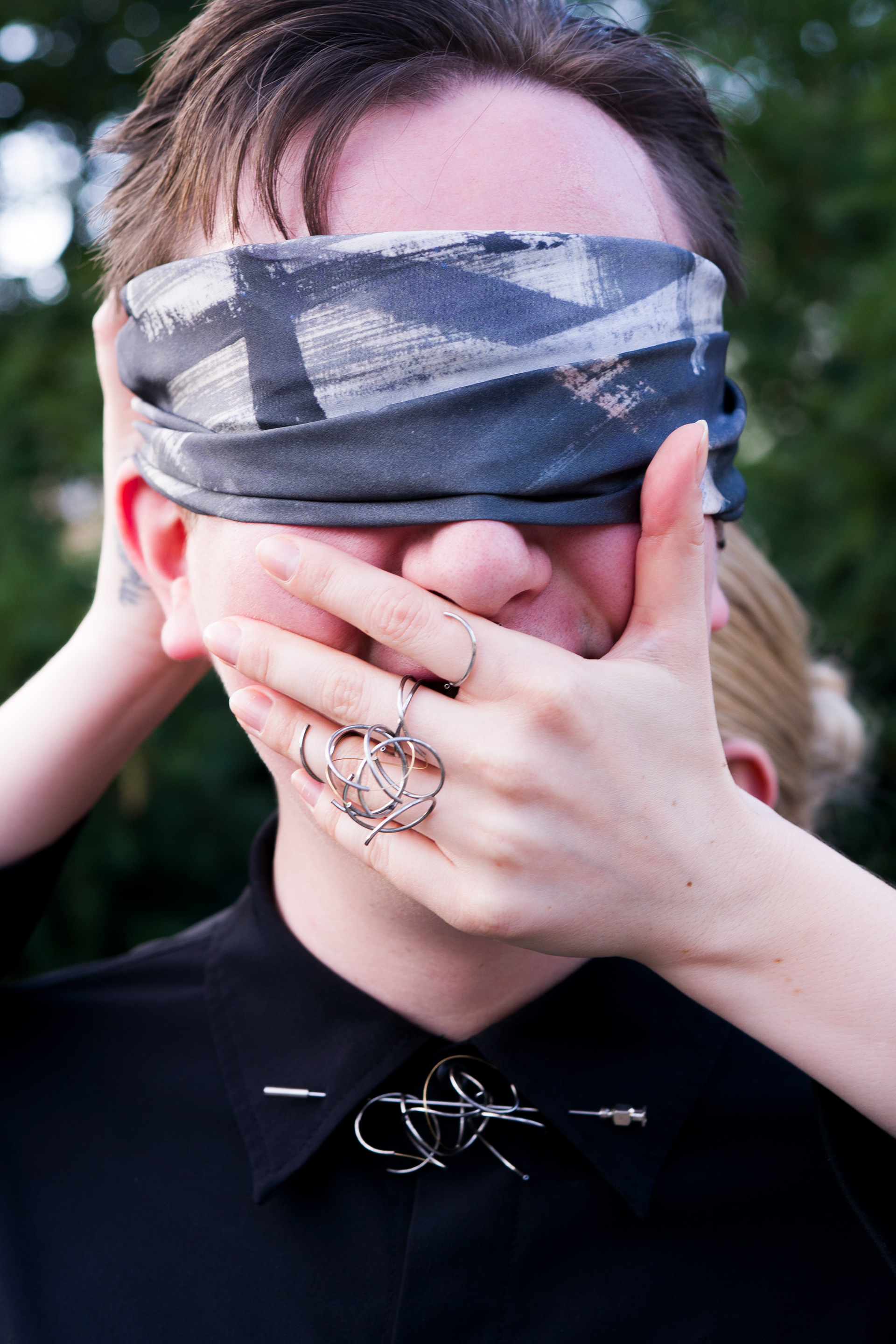 Spolupráce designerů Kataríny Nábilkové a Adama Pisci – New Episode, upcyklované šperky z vyřazených jehel (Katarína) a šátky z autorským potiskem (Adam)