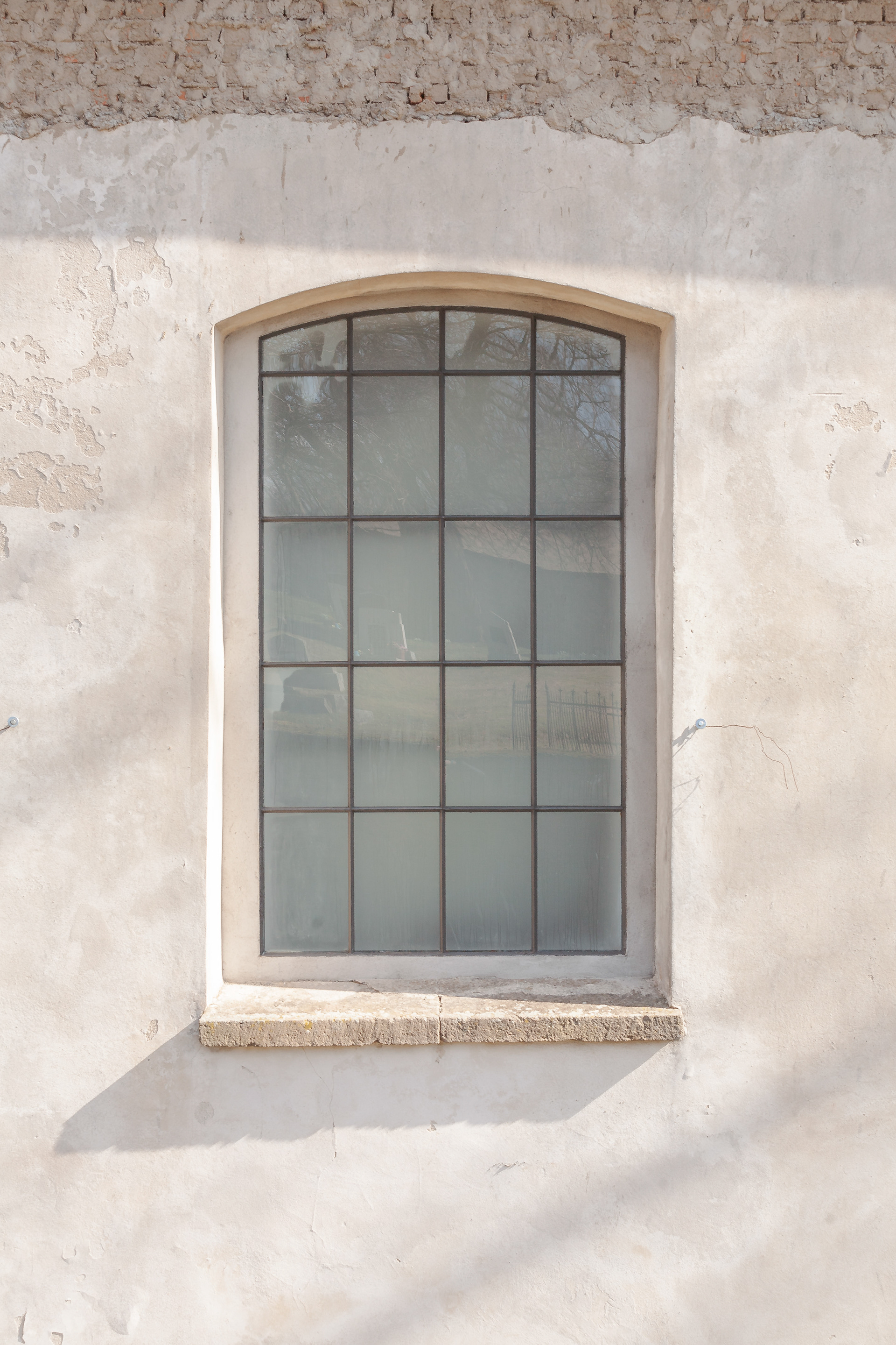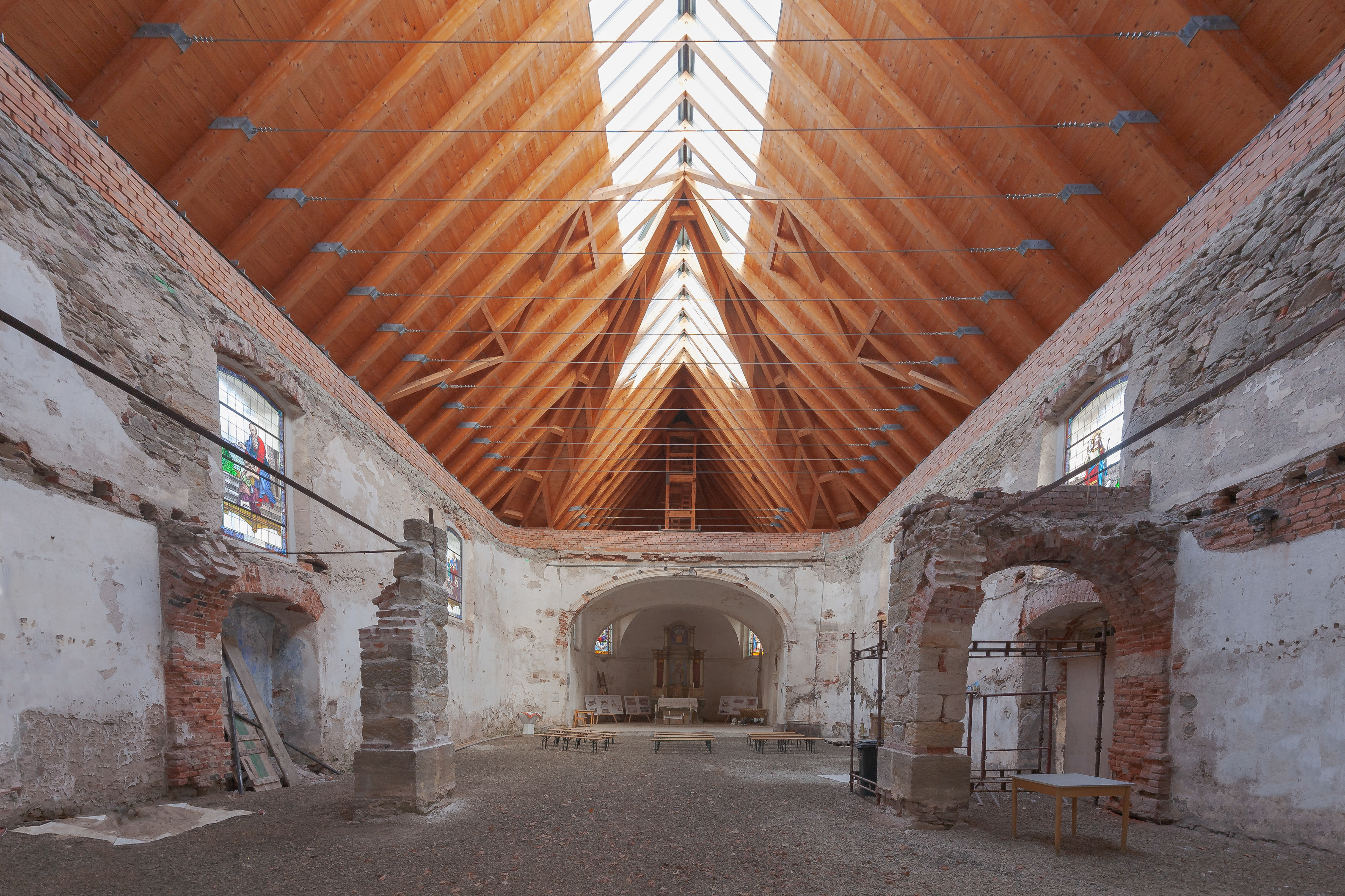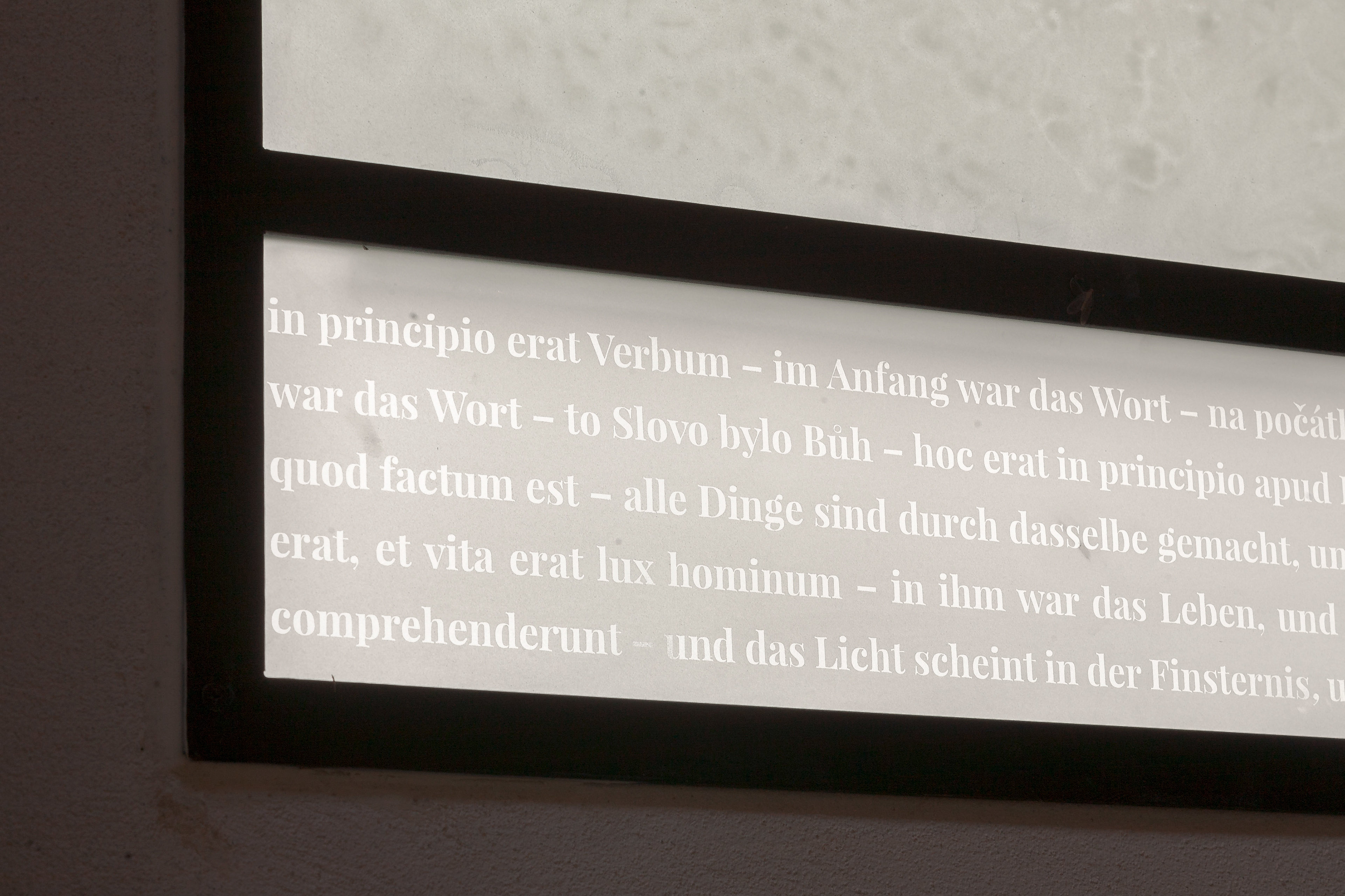 Vitrajenkostela se skleněnou střechou v Petrovicích od Lady Semecké, promítající v ten správný okamžik verše z Bible.