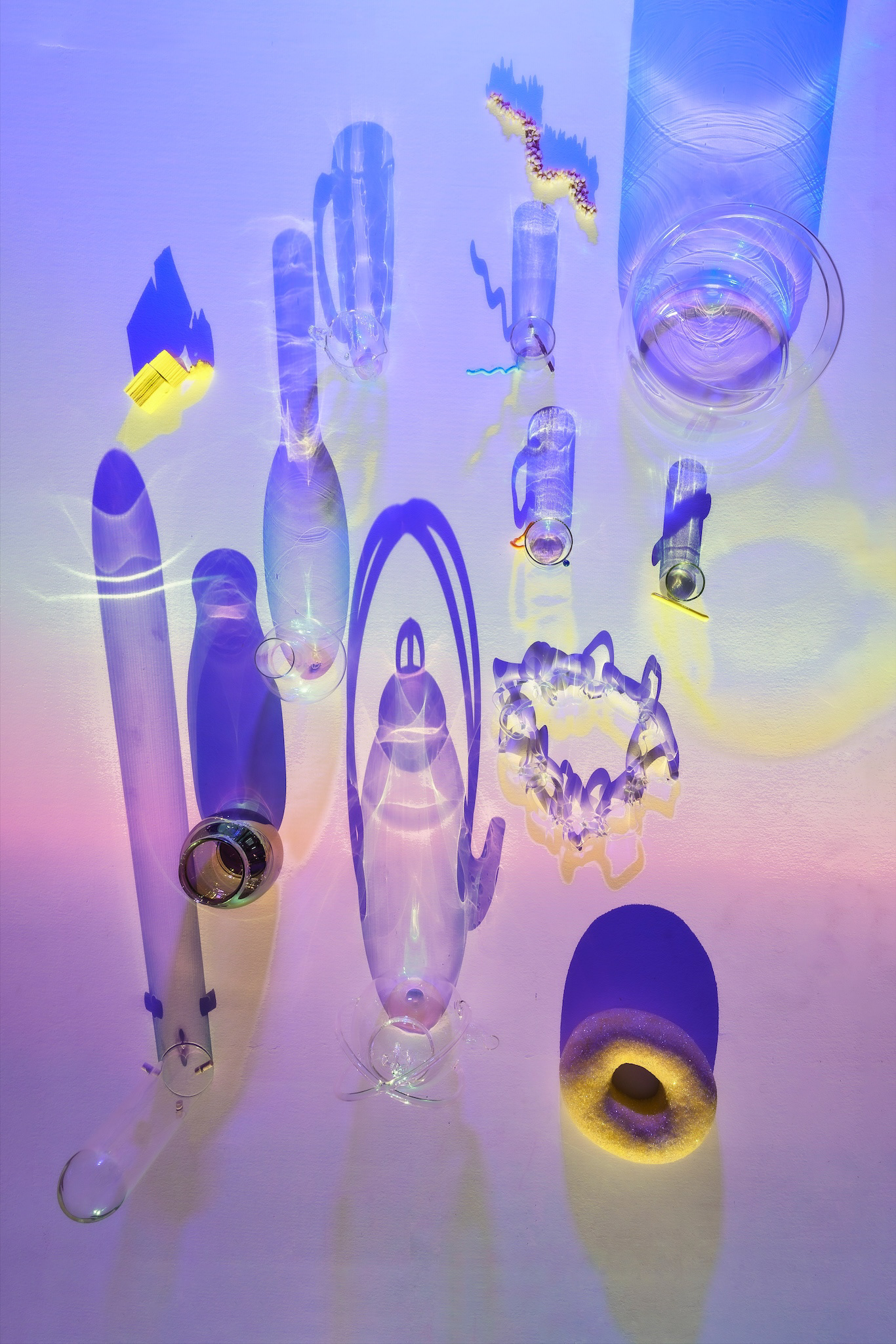 Hravý a barevný vizuál pro ateliér Sklo, FUD UJEP na Designblok s tématem Ostrov a účinkujícími objekty a díly vystavujících studentů.